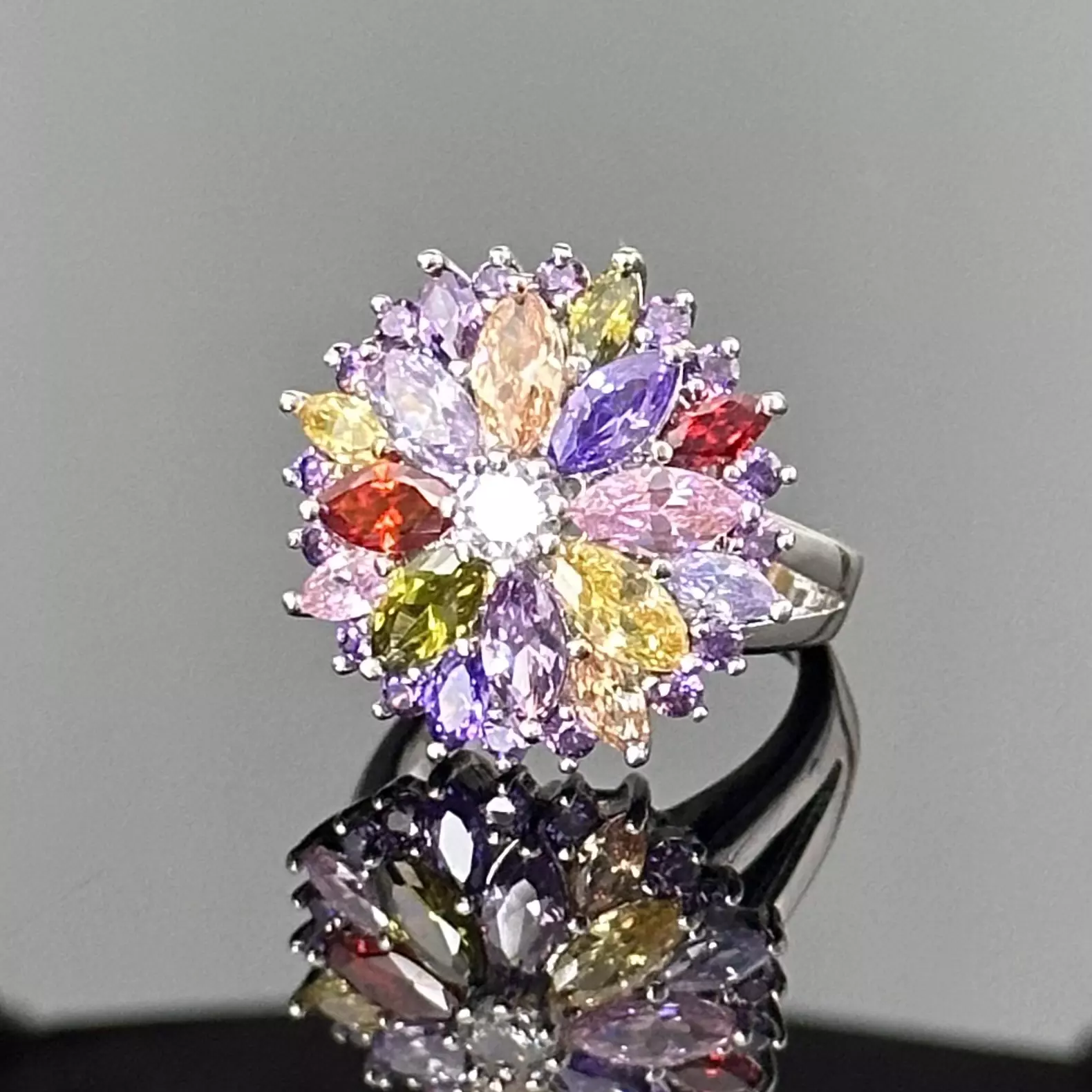 Srebrny pierścionek koktajlowy o wielu barwach