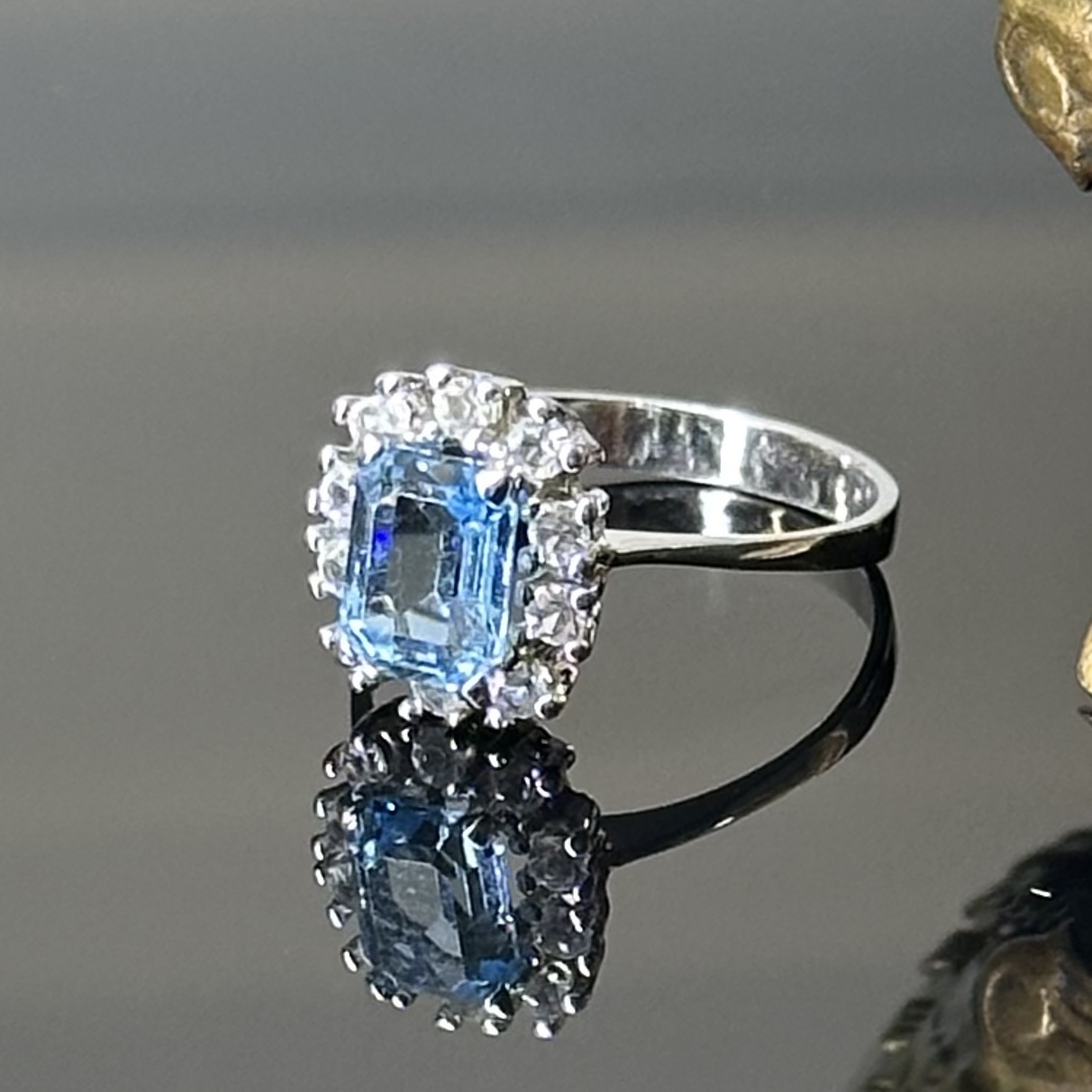 Klasycystyczny pierścionek srebrny wykonany na wzór Wiktoriański w części środkowej zafasowany Akwamaryn, a w koło obsadzono Cyrkonie. Projekt został wykonany z srebra próby 925, około 1980 roku.