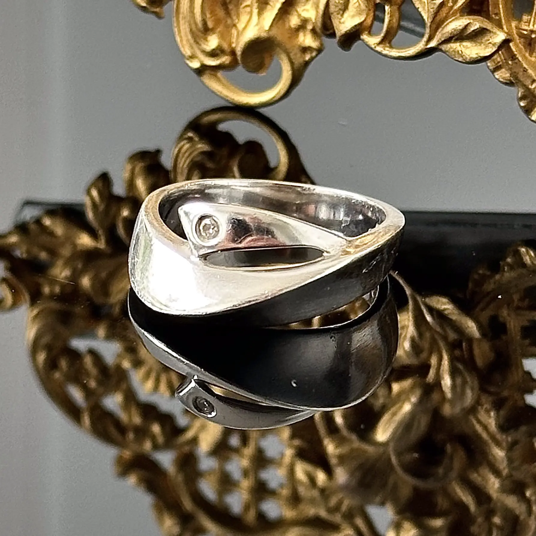 Srebrny pierścionek z centralnie osadzoną Cyrkonią, Pierścionek został wykonany ok. 1980 roku z srebra próby 925 (próba bita i potwierdzona kwasowo), powierzchnia została zaprojektowana i wykonana w nowoczesnym designie, całość znajduje się w bardzo dobrym stanie.