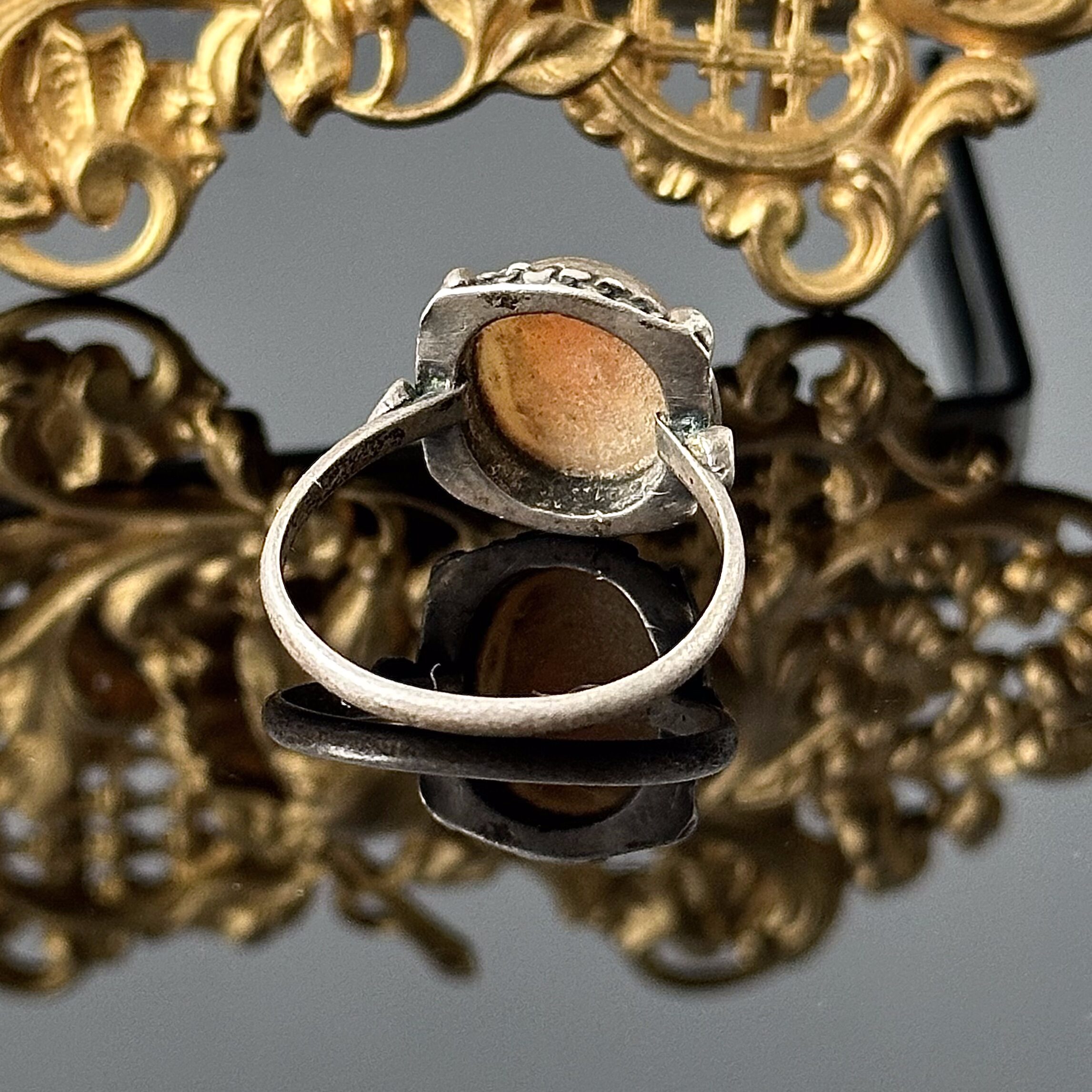 Ten przepiękny okaz pierścionka z Kameą wykonany w naturalnej muszli, został wykonany w okresie Napoleona II - jest to oryginał z ok. 1860 roku czyli mamy tu przedmiot z przed 165 lat. Wspaniałe wykonanie w kaboszonie z wielką dbałością o szczegóły i odzwierciedlenie okresu w którym została wykonana. Kamea została oprawiona w srebro próby 800 (próba potwierdzona kwasowo). Produkt znajduje się w swoim oryginalnym bardzo dobrym stanie, nie odczyszczonym i nie polerowany, polecam dlo kolekcjonerów i inwestorów biżuterii.