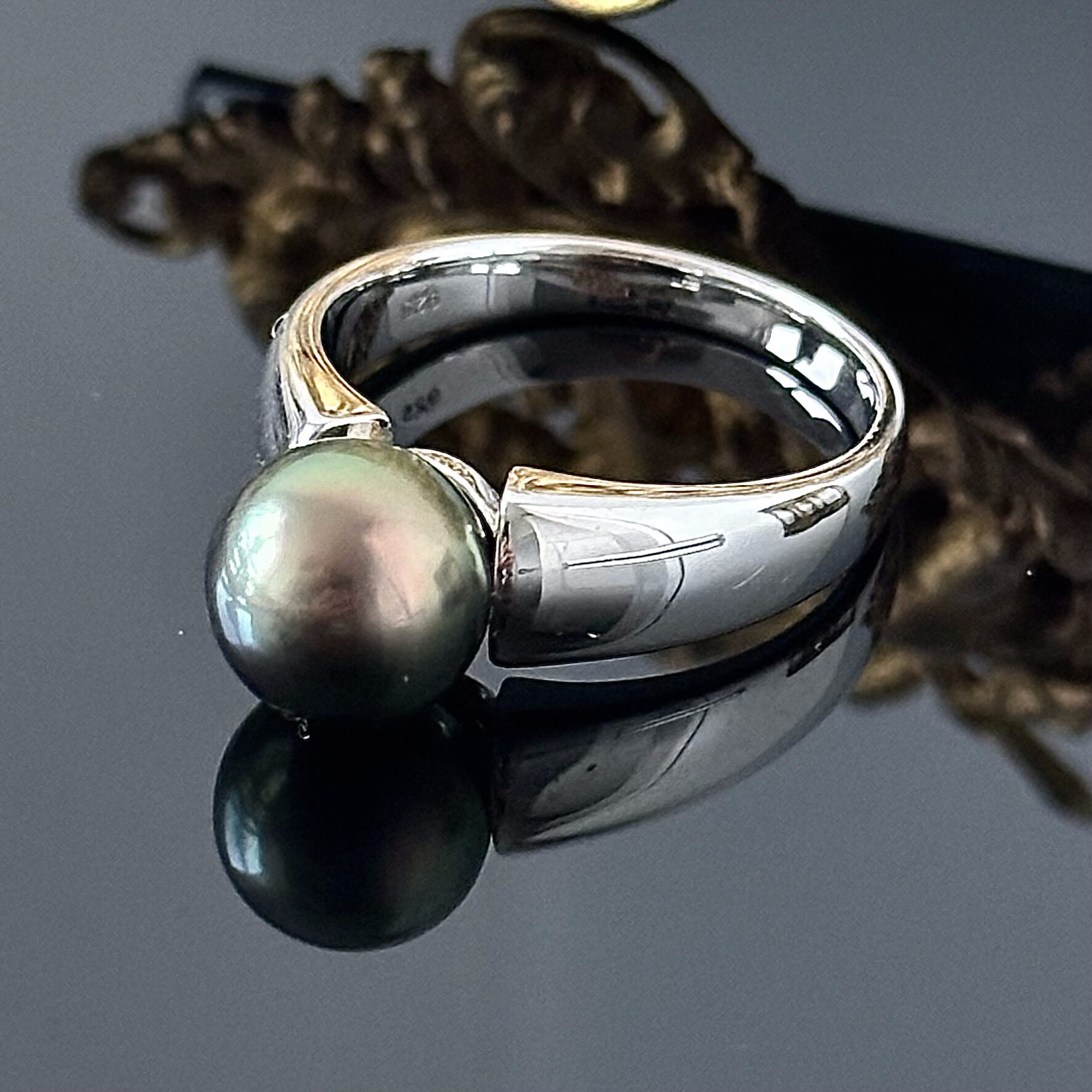 Srebrny pierścionek wykonany z naturalną barwioną Perłą. Pierścionek został wykonany z srebra próby 925 (próba bita i potwierdzona kwasowo) dodatkowo wybito próbę producenta, w części centralnej artysta zafasował okrągłą barwioną na delikatną zieleń Perłę, we wnętrzu została wypolerowany. Całość znajduje się w bardzo dobrym stanie, brak śladów użytkowania.