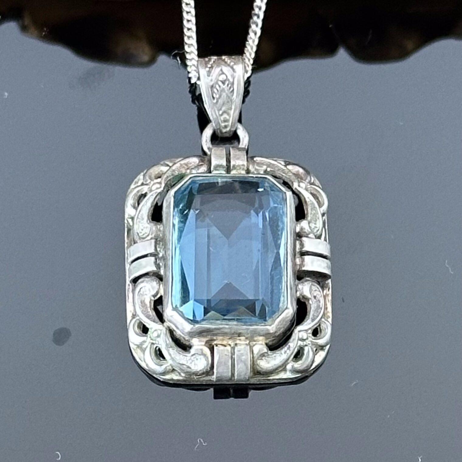 Srebrna przywieszka z Akwamarynem - oryginał z około 1880 roku. Ta wspaniała oryginalna przywieszka pochodzi z okresu eklektyzmu, końca XIX wieku, wykonana w srebrze próby 800. Przywieszka znajduje się w bardzo dobrym stanie, brak uszkodzeń lub zarysowań, kamień jest również bez zarysowań i zmatowień na kantach faset.