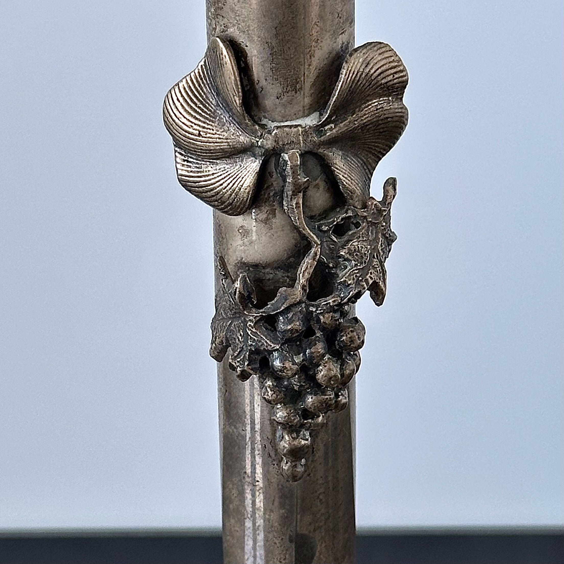 Srebrny świecznik secesyjny z elementami winorośli. Świecznik pochodzi z ok. 1900 roku, został wykonany z srebra próby 900 (próba bita i potwierdzona kwasowo), pochodzi z Francji a dokładnie Awinion . Świecznik znajduje się w bardzo dobrym oryginalnym stanie i jest godny polecenia dla kolekcjonerów, nie był polerowany i nie jest czyszczony.