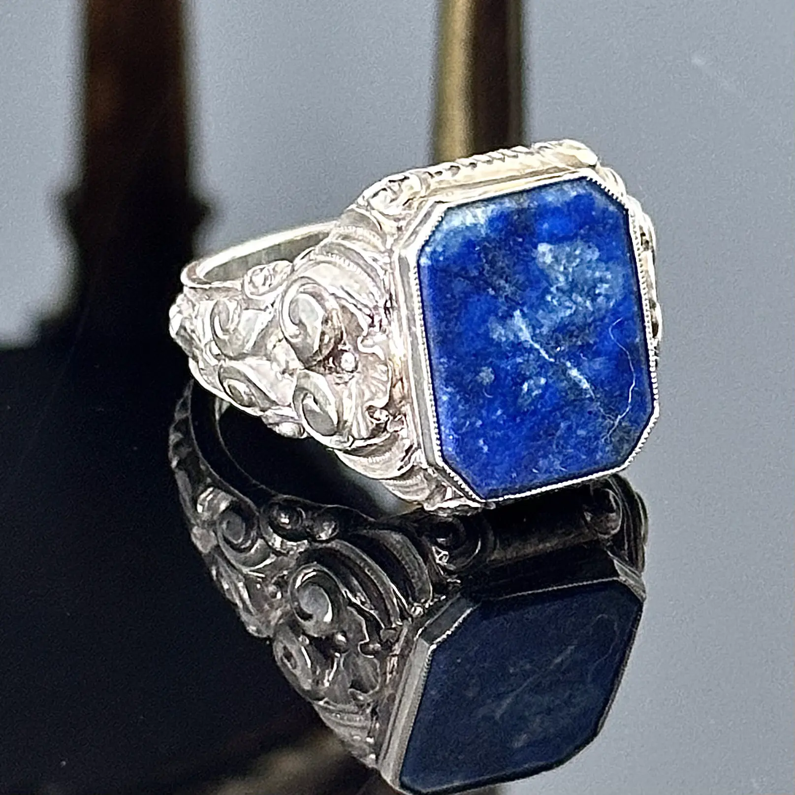 Srebrny sygnet męski z naturalnym Lapis Lazuli. Wyjątkowy projeket z bogatymi wzorami renesansowymi wykonanymi ok. 1900 roku z srebra próby 835 (próba potwierdzona kwasowo). Całość znajduje się w oryginalnym bardzo dobrym stanie i jest godna polecenia.