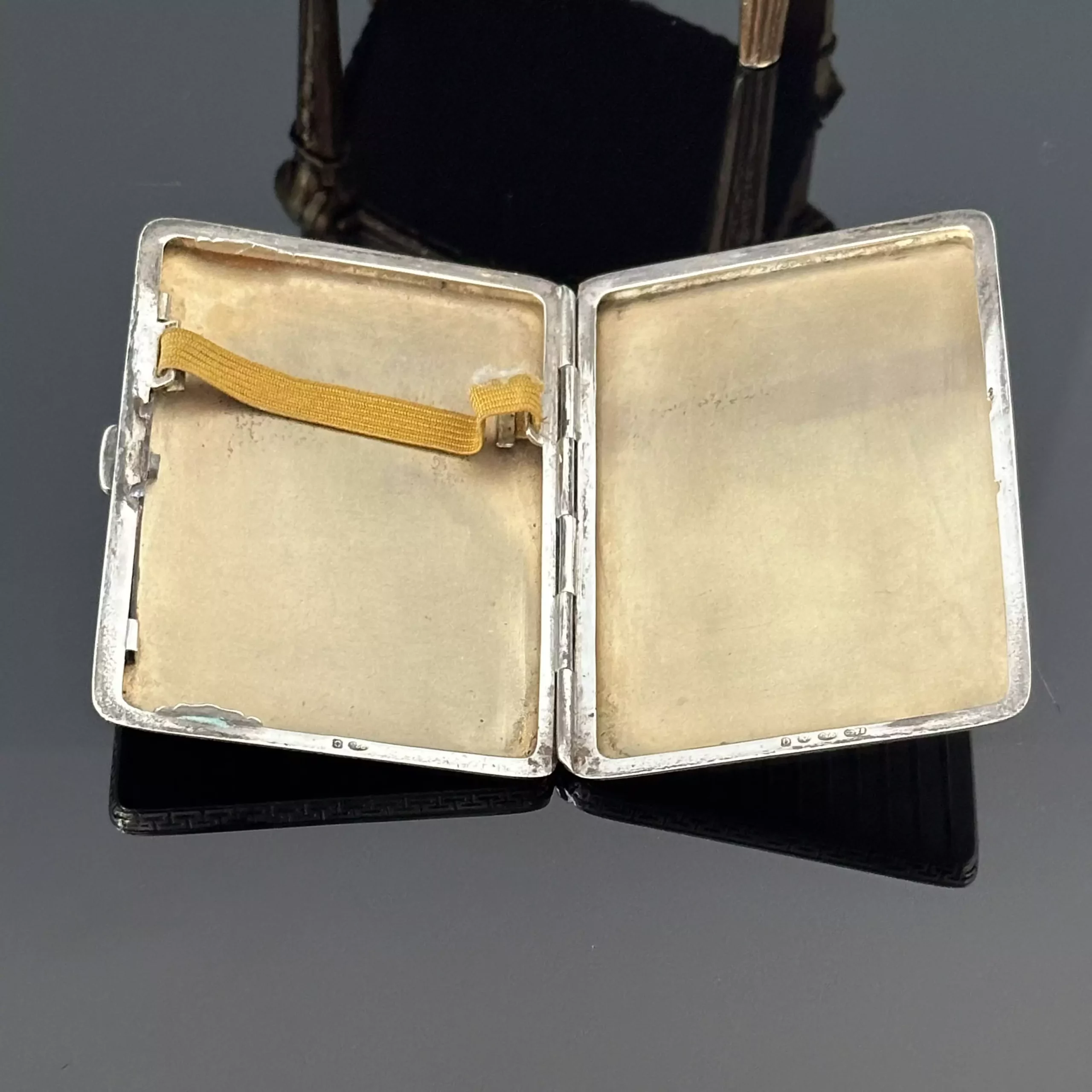 Papierośnica znajduje się w wyśmienitym stanie, brak uszkodzeń, zalecam wymianę gumki. Grawerka bez przetarć, wyrób jak na swój wiek jest kąskiem dla kolekcjonerów lub może być wspaniałym prezentem.