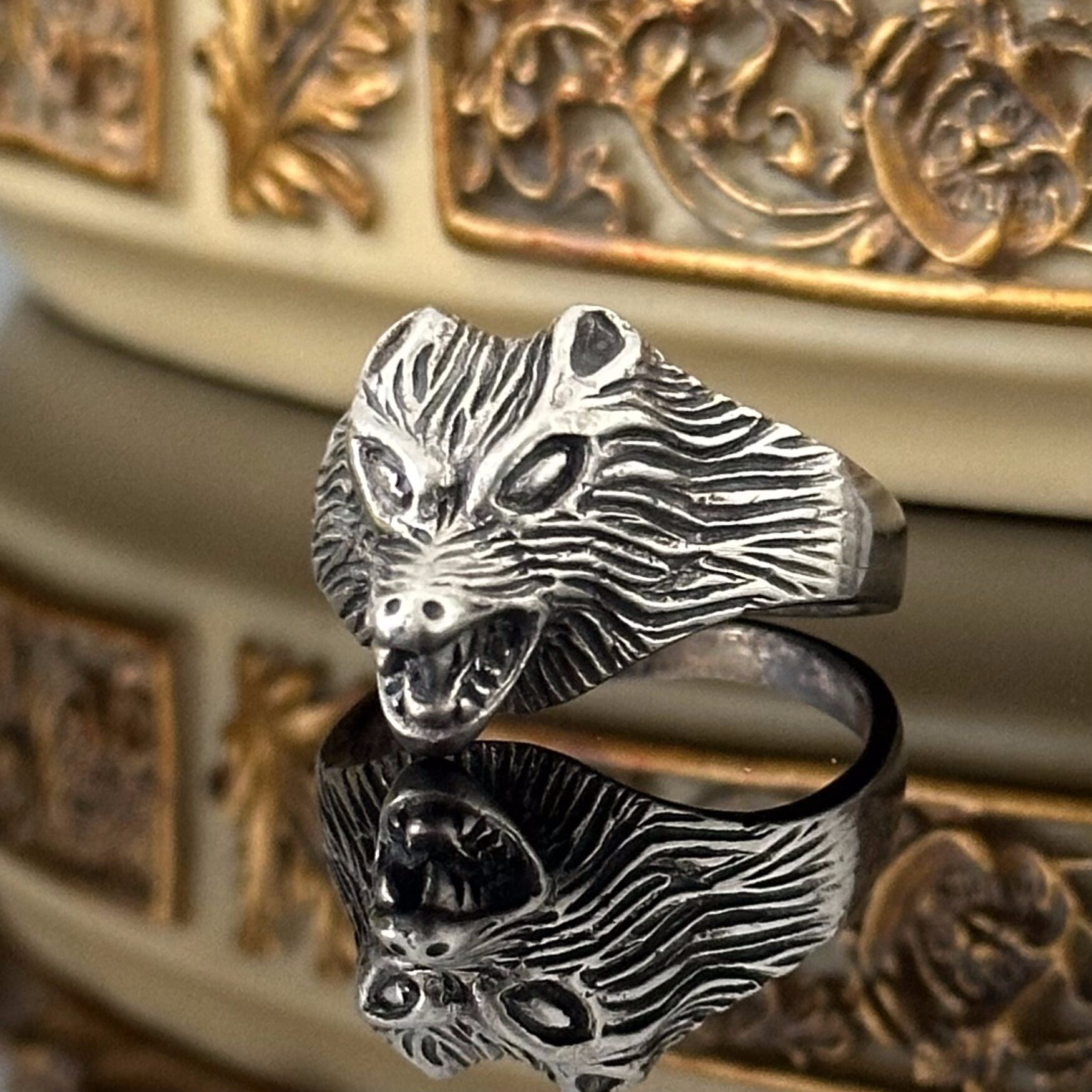 Srebrny sygnet męski z głową wilka. Projekt wykonany przez fachowego jubilera w srebrze próby 925. Sygnet znajduje się w znakomitym stanie.