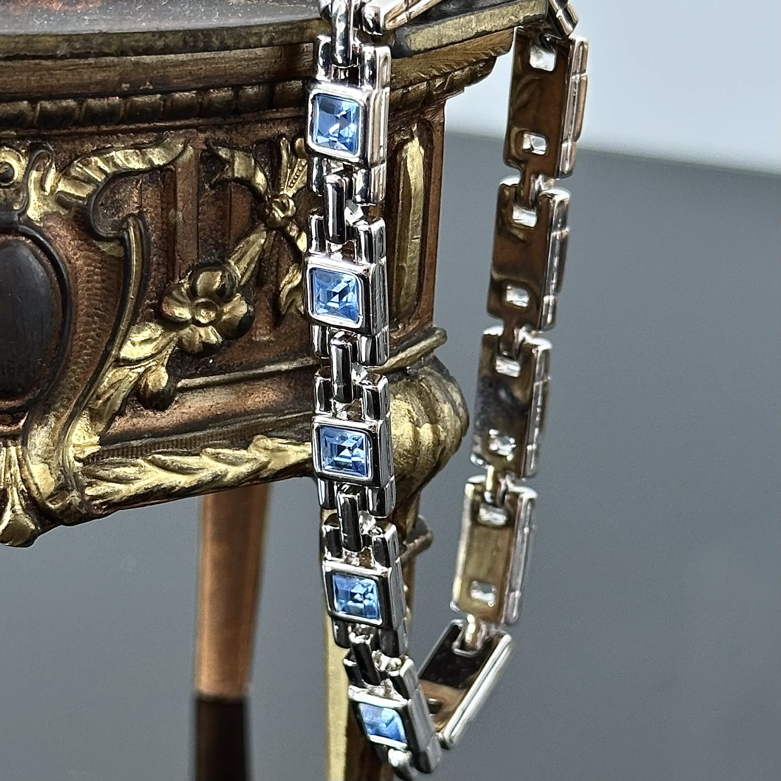 Bransoletka tenisowa z Akwamarynami, pięknie mieniące się błękitne kamienie nadają uroku temu projektowi. Bransoletka została w całości wykonana z wysokiej jakości stali chirurgicznej co powoduje że jest bardzo mocna, zabezpieczona przed ciemnieniem i powoduje że będzie się stale błyszczeć. Wspaniały efektowny model do używania na codzień, bransoletka znajduje się w bardzo dobrym stanie i jest godna polecenia.