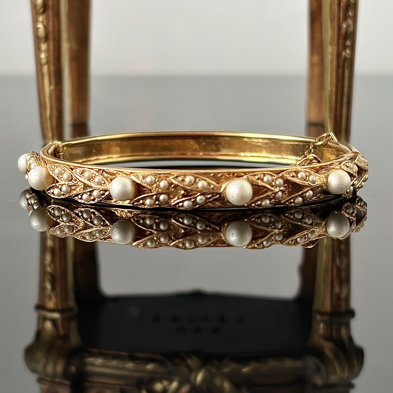 Elegancka, antyczna bransoleta pozłacana 24 karatowym złotem, zdobiona rzędem pereł osadzonych w dekoracyjnej, ażurowej oprawie o motywach roślinnych. Delikatne perełki zostały harmonijnie rozmieszczone na całym froncie bransoletki, tworząc subtelny i ponadczasowy efekt. Konstrukcja typu bangle z zawiasem zapewnia wygodne zakładanie, a dodatkowy łańcuszek zabezpieczający chroni przed przypadkowym rozpięciem. Całość wyróżnia się kunsztownym wykonaniem i klasycznym charakterem typowym dla biżuterii z przełomu XIX i XX wieku.
