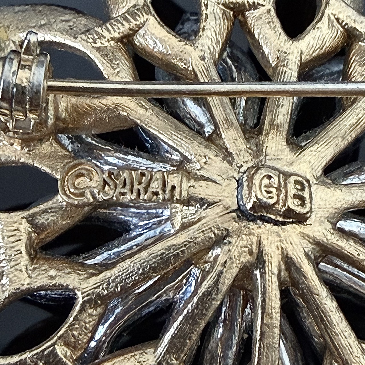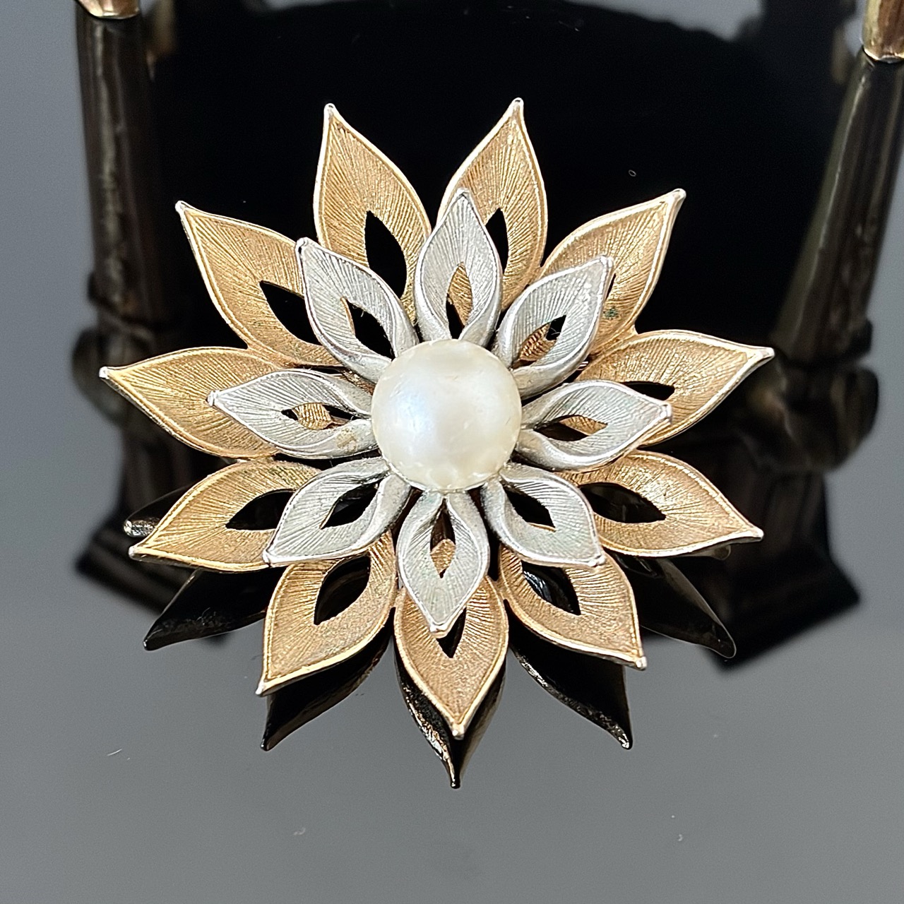 Efektowna broszka w formie rozety kwiatu wykonana przez markę Sarah Coventry. Kompozycja zbudowana jest z wielu warstw ażurowych, fakturowanych płatków w dwóch kolorach metalu – złotym i srebrnym. W centrum osadzona jest perła syntetyczna, która stanowi spokojny, elegancki kontrapunkt dla bogatej struktury płatków. Całość tworzy bardzo przestrzenną, dekoracyjną formę typową dla biżuterii kostiumowej lat 60. i 70., kiedy Sarah Coventry słynęła z wyrazistych, kwiatowych projektów.