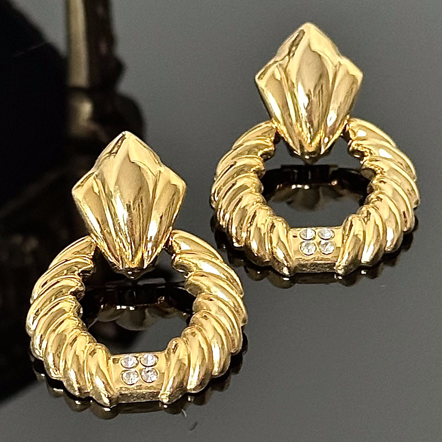 Złote oryginalne kolczyki z kolekcji Pierre Lang z kamieniami Swarovskiego - pochodzą z początków produkcji tej firmy. Klasyczny model z ok 1986 roku pozłacany 24 karatowym złotem, wysadzane kamieniami Swarovskiego. Kolczyki są jak nowe, nigdy nie były używane, znajduje się w idealnym stanie nie noszona, zdecydowanie polecam dla miłośników firmy Pierre Lang bo to klasyk już nie osiągalny.