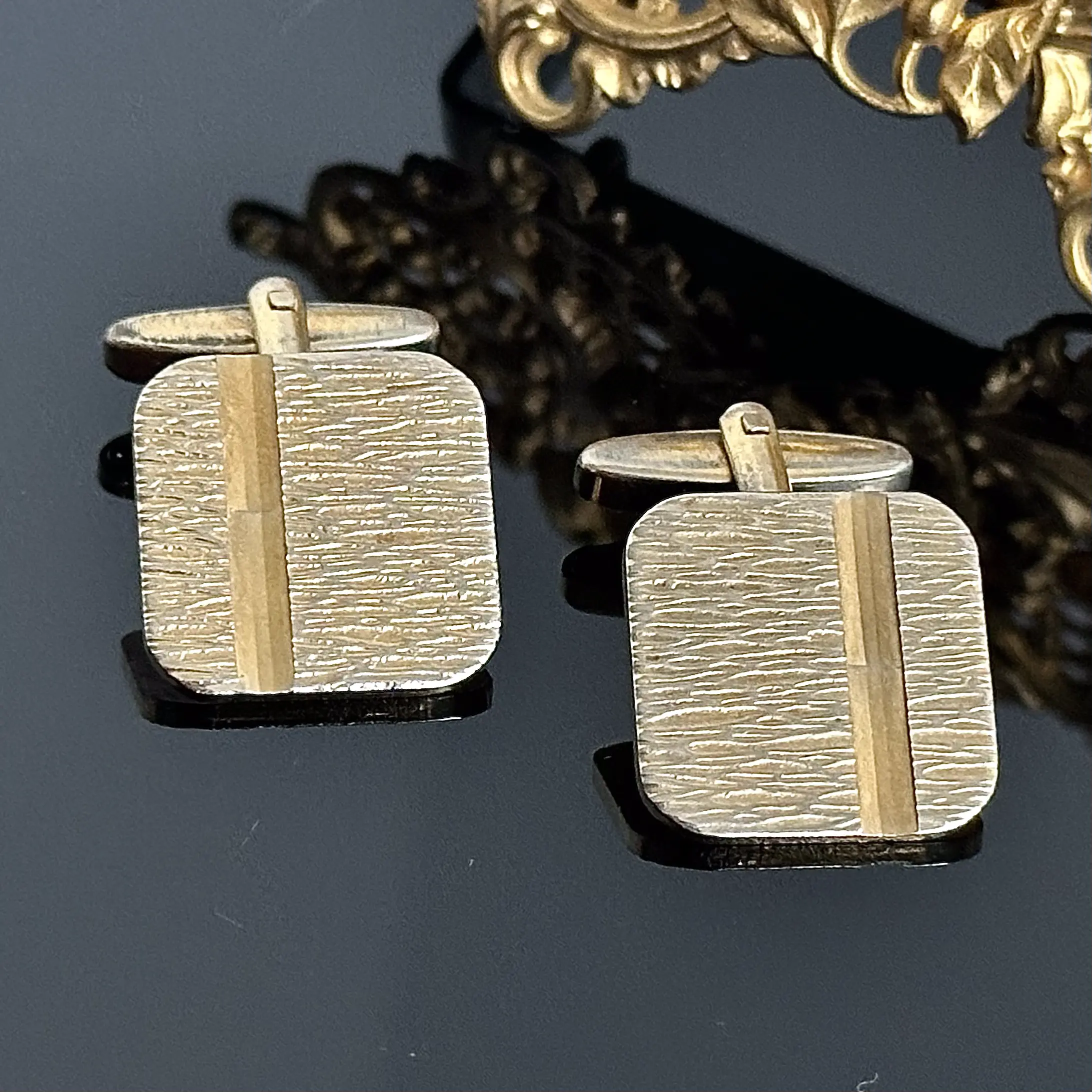 Złote eleganckie spinki do koszuli "Manhattan" z lat 70-tych. Pochodzą z Nowego Jorku, należały do kolekcjonera spinek. Wzór z przepiękną głęboką lustrzaną poświatą w zależności od konta padania światła, oddaje kolorystyczny urok i blask, wspaniały efekt optyczny złota. Całość pokryta powłoką zabezpieczającą przed ciemnieniem, stan dobry.
