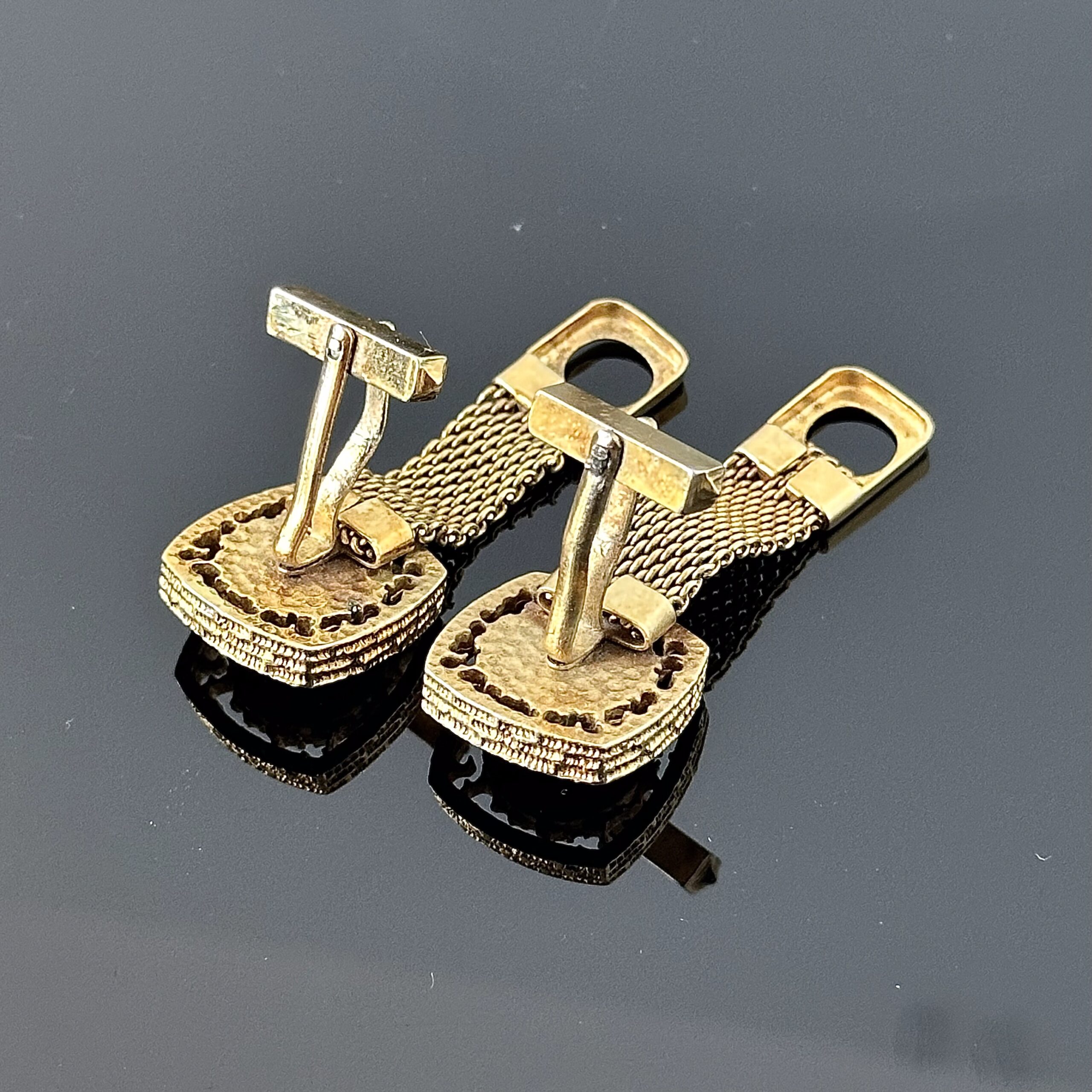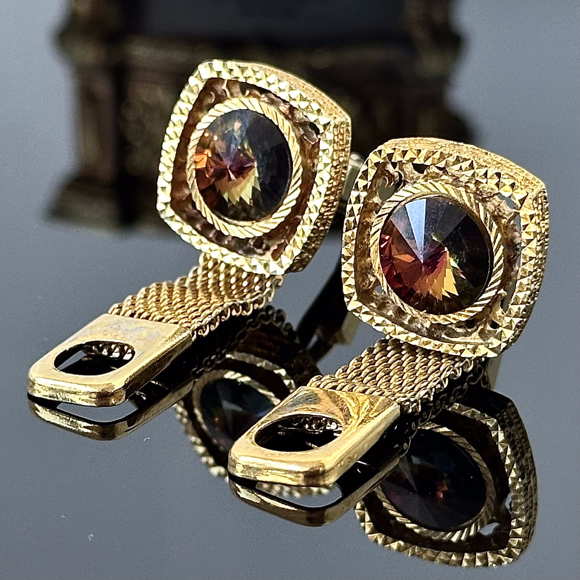 Złote eleganckie spinki do koszuli "Manhattan" z kamieniami Swarovskiego oraz złotym łańcuszkiem łączącym mankiety. Pochodzą z Nowego Jorku, zostały wykonane ok. 1970 roku, należały do kolekcjonera spinek. Kamień z przepiękną głęboką lustrzaną różnorodnych kolorów w zależności od konta padania światła, oddaje kolorystyczny urok i blask, wspaniały efekt optyczny. Całość pokryta powłoką zabezpieczającą przed ciemnieniem i znajduje się w bardzo dobrym stanie.