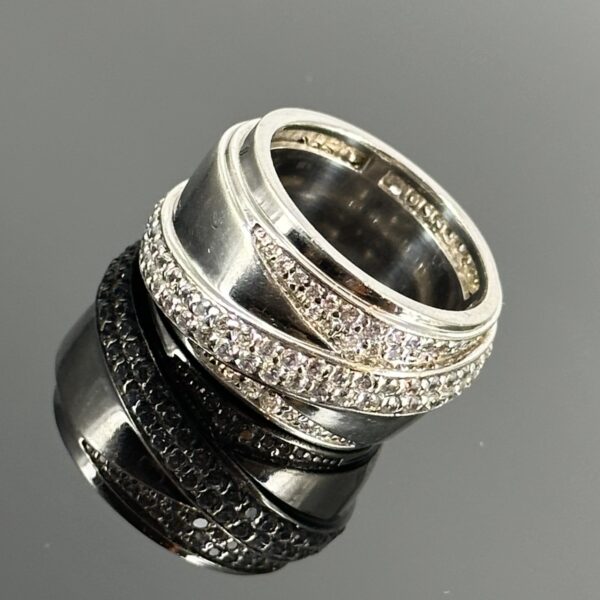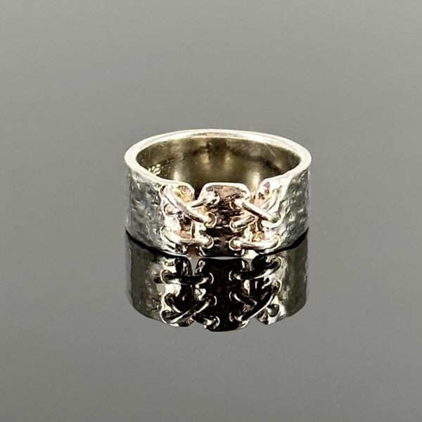 To klasyka sztuki jubilerskiej, pierścionek został wykonany z srebra próby 800